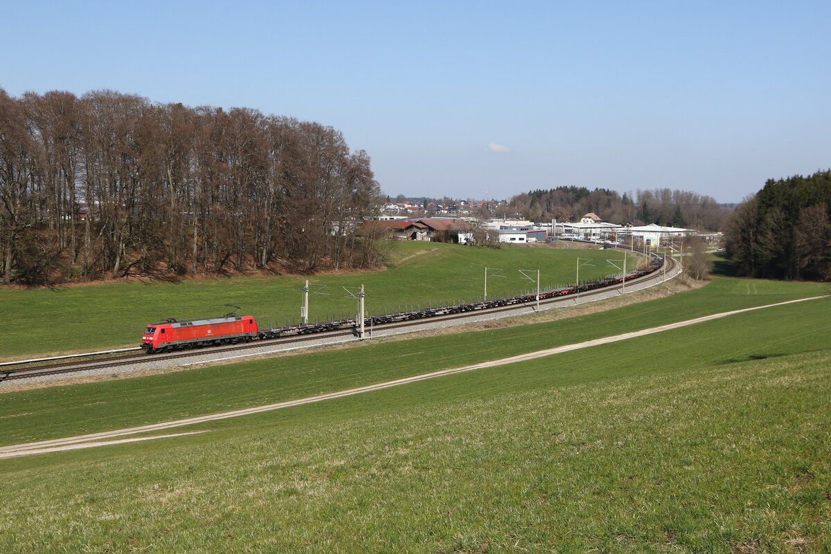 185 395 war am 19. Januar 2022 mit einem "Mischer" bei Grabenstätt im Chiemgau in Richtung München unterwegs.